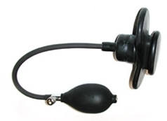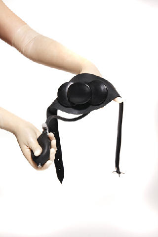 An inflatable latex 5cm mouth gag on head strap connected to a breath tube
