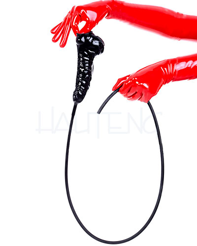 A 20 centimeter long latex anatomical penis sheath with connected one meter long hollow rubber tubing at penis tip. Black only