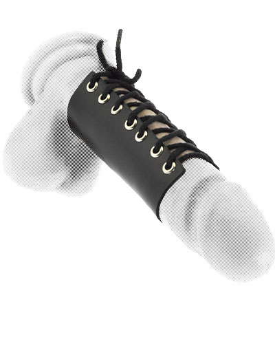 A laced latex bondage penis sheath with eyelets and adjustable laces for tightness.