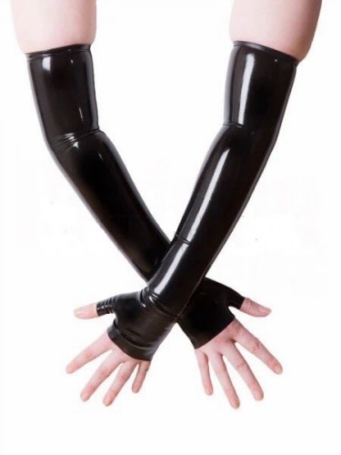 A pair of latex fingerless elbow gauntlet gloves measuring approximately 50cm in length. Available in a selection of colours and sizes and also available in two thicknesses 0.4 or 0.6mm